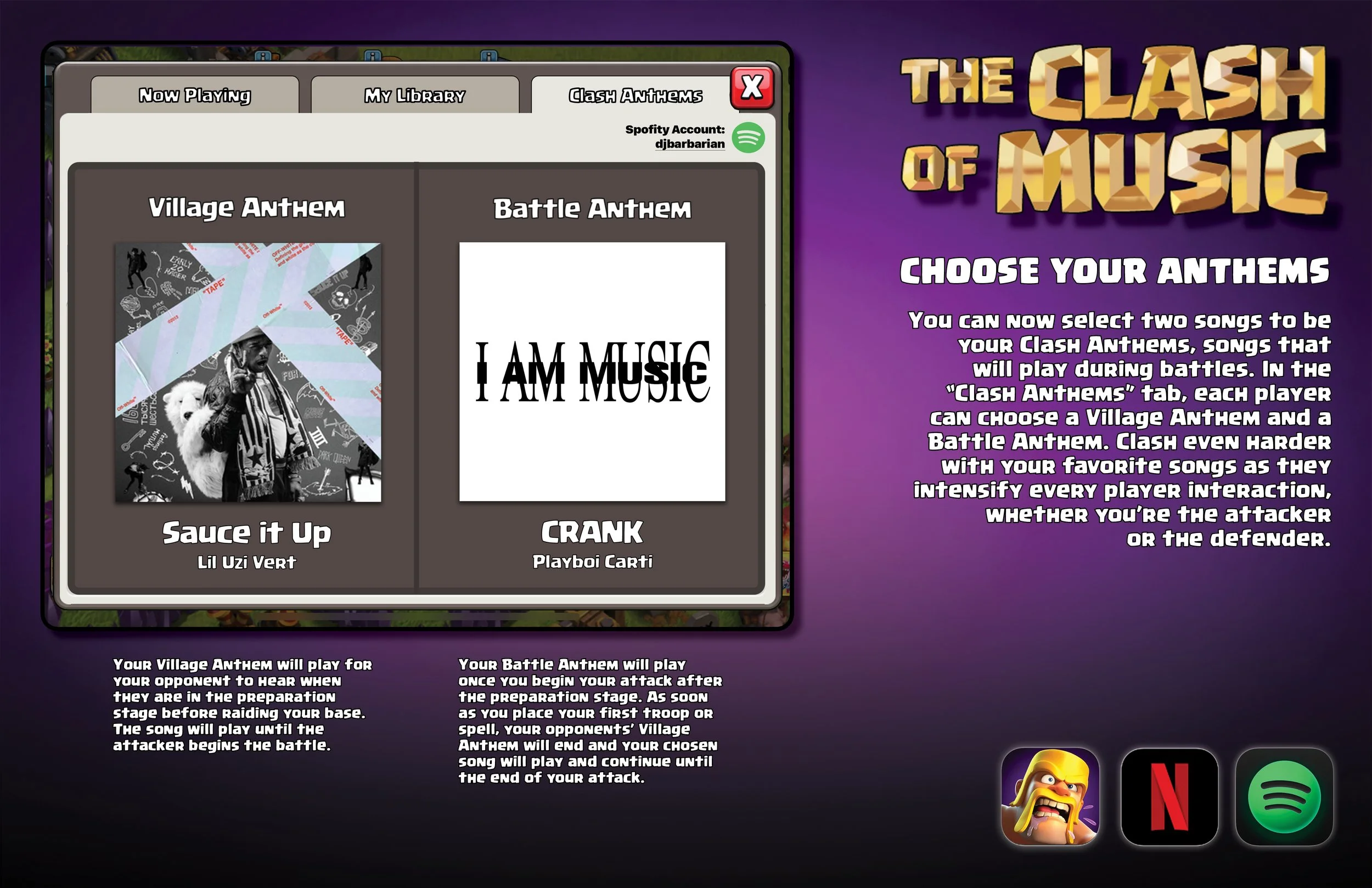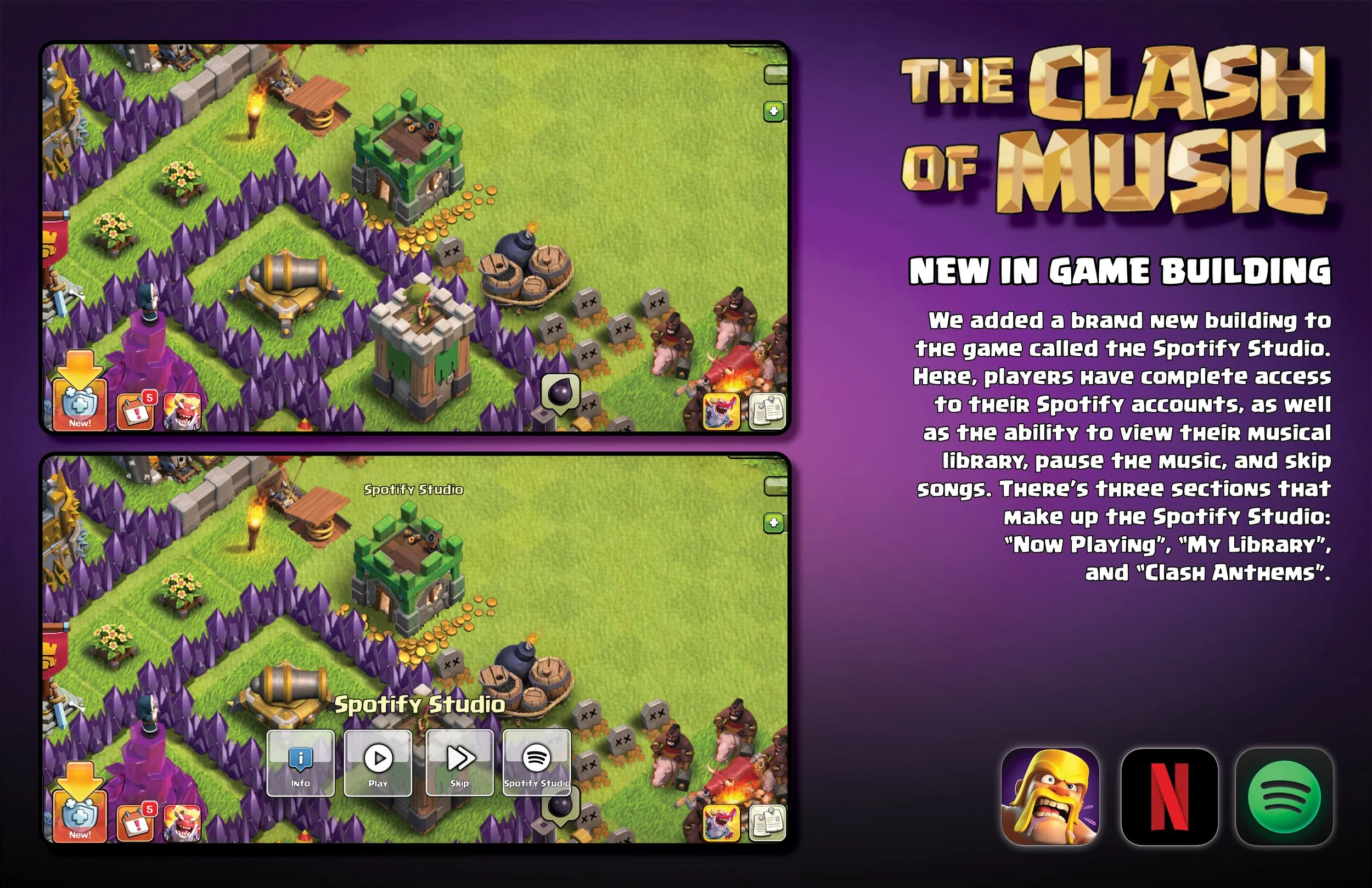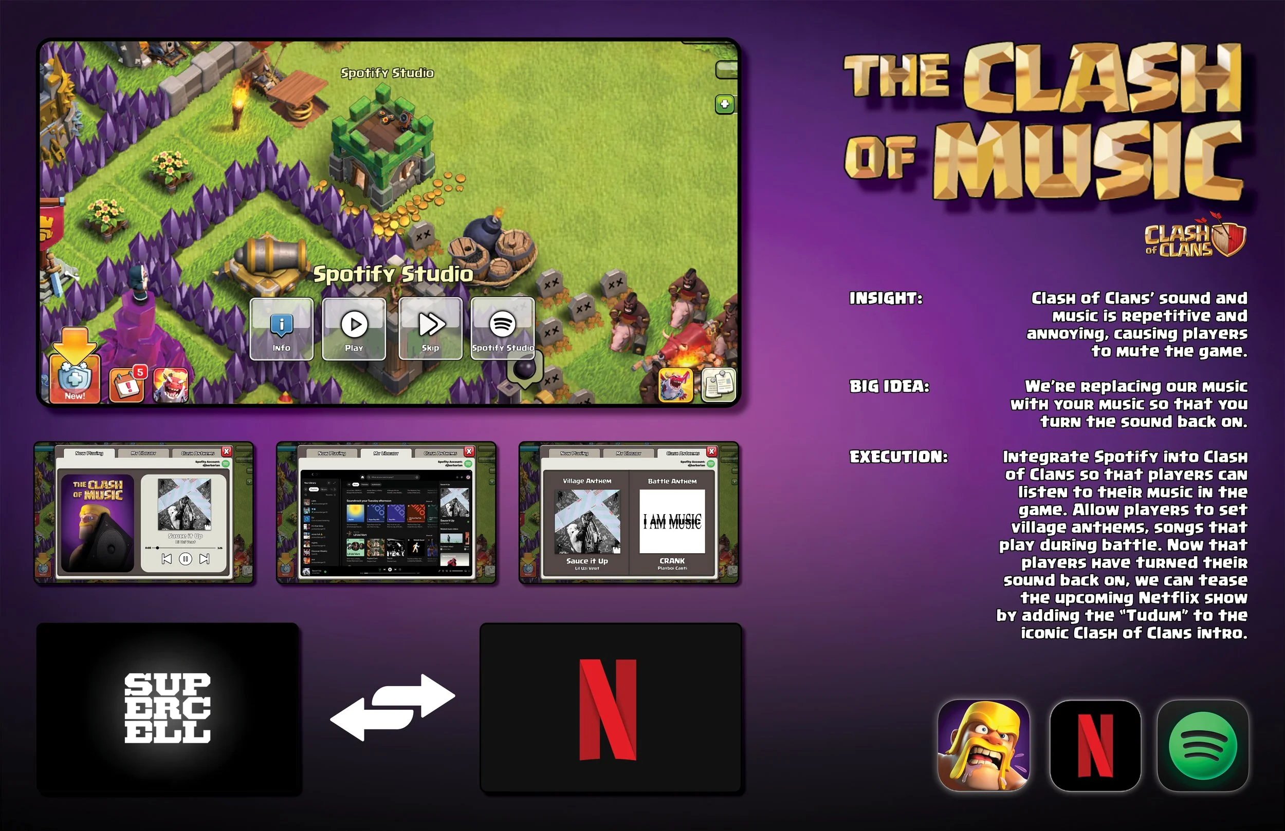 Execution: Integrate Spotify into Clash of Clans so that players can listen to their music in the game. Allow players to set village anthems, songs that play during battle. Now that players have turned their sound back on, we can tease the upcoming Netflix show by adding the “Tudum” to the iconic Clash of Clans intro.